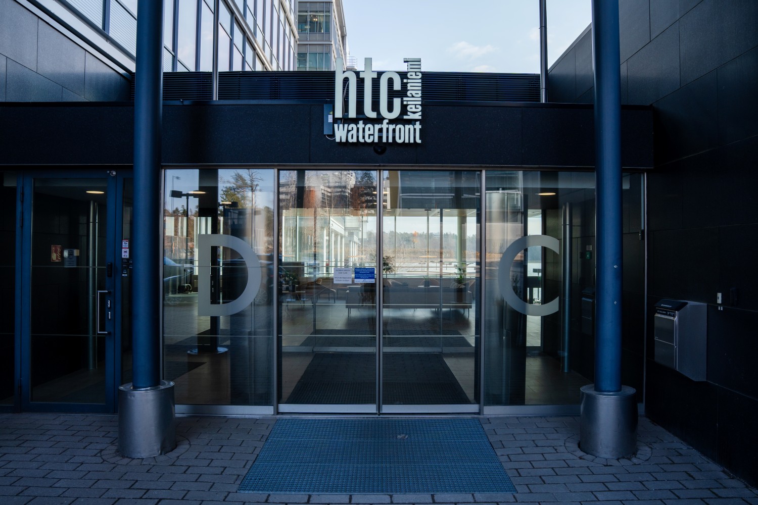 Companies and brands working in HTC Keilaniemi Waterfront are proudly shown outside the building.
